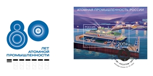 На почтовом блоке изображена плавучая атомная теплоэлектростанция «Академик Ломоносов».