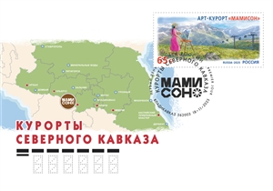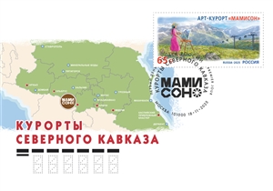 На почтовой марке изображены художница, работающая на пленэре, и пейзажи курорта с канатной дорогой.