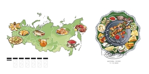На почтовой марке изображены русские блины с красной икрой и сливочным маслом; на полях блока — блинчики с различными начинками, сметана, мёд, варенье и различные ягоды.