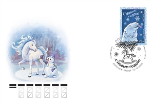 На второй почтовой марке представлена работа Ляшенко Анастасии — символ наступающего года, красная лошадь на фоне почтового ящика и новогоднего узора, матрёшка.