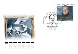 На почтовой марке изображён портрет Н.Н. Бурденко на фоне фотографии из операционной.