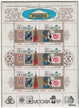 Композицию марок, выпуск которых приурочен к Всемирной филателистической выставке «Москва-97», дополняет изображение башен Московского Кремля – Набатной (1495) и Спасской (1491), эмблема выставки и ее талисман – горностай, а также текст: «Всемирная филателистическая выставка «Москва-97».
