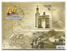 Почтовый блок посвящен 60-летию Курской битвы во время Великой Отечественной войны 1941-1945 гг. В ходе оборонительных сражений в июле 1943 года войска Центрального и Воронежского фронтов отразили наступление фашистских войск, сорвав попытку противника окружить и уничтожить советские войска на Курской дуге. После этого Советская армия перешла в контрнаступление и до конца августа 1943 года разгромила 30 вражеских дивизий, освободив при этом города Орел, Белгород, Харьков. На марке блока изображен памятник Победы (Звонница) в деревне Прохоровке и Триумфальная арка в Курске. На полях блока - карта-схема контрнаступательной операции советских войск.