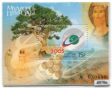 Всемирная выставка «ЭКСПО-2005» будет проходить с 25 марта по 25 сентября 2005 года в Японии, в департаменте Аити. Япония неоднократно удостаивалась права на проведение крупнейших выставочных мероприятий. ЭКСПО принималась на японской земле трижды: в 1970, 1975 и 1985 годах. Главной задачей выставки «ЭКСПО-2005», проходящей под девизом – «Мудрость природы», является выработка нового подхода к решению глобальных проблем, при условии сохранения разнообразных индивидуальных особенностей и обычаев мировых культур и цивилизаций. В соответствии с российской концепцией, разработанной Российской академией наук и утвержденной на заседании оргкомитета, темой участия России в «ЭКСПО-2005» будет «Гармония ноосферы». На рисунке марки показана эмблема российской экспозиции, посвященной гармонии ноосферы, и изображено дерево как знак жизни и символ мироздания. На полях блока – условное изображение фрагмента периодической таблицы химических элементов, созданной гениальным русским ученым-химиком Д.И. Менделеевым, фрагмент иконы Андрея Рублева «Спас» – шедевра древнерусской иконописи, а также репродукция рисунка Леонардо да Винчи так называемый квадрат древних, в основу которого заложено правило изображения человеческой фигуры - золотая пропорция.