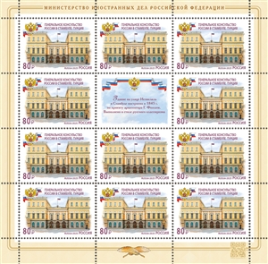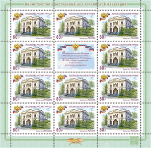 На почтовых марках изображены здания Генконсульства России в Стамбуле, Посольства России в Германии и Посольства России в Уругвае.