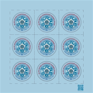 На почтовой марке изображён стилизованный символ атома; внутри его орбит — схематичные изображения военного корабля, истребителя, искусственного спутника Земли, атомной электростанции, микросхемы, искусственного интеллекта; в центре — малая эмблема Службы внешней разведки Российской Федерации.