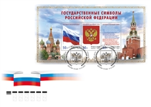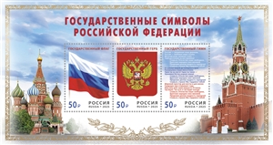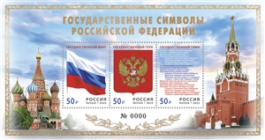 На почтовых марках изображены государственный флаг, государственный герб и государственный гимн Российской Федерации; на полях почтового блока — Спасская башня Московского Кремля, а также Собор Покрова Пресвятой Богородицы на Рву.
