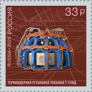 На почтовой марке изображена термоядерная установка Токамак Т-15МД.