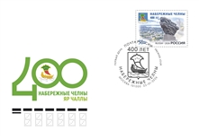 На почтовой марке изображены герб города Набережные Челны, памятник «Родина-мать», бизнес-центр и панорама города с рекой Камой.