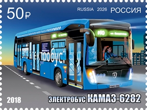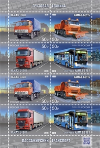 На почтовых марках изображены грузовая техника и пассажирский транспорт КАМАЗ: первый грузовик КАМАЗ-5320, комбинированная дорожная машина на базе КАМАЗ-65115, электробус КАМАЗ-6282 и седельный тягач КАМАЗ-54901.