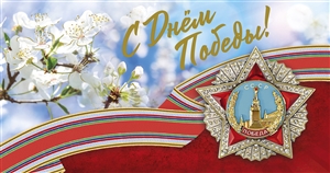 № 2026-025/5. С Днём Победы! Орден и лента Ордена Победы на фоне голубого неба и веточки яблони