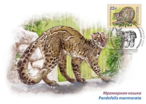 На почтовой марке изображен представитель семейства кошачьих: мраморная кошка, живущая на территории Лаоса.