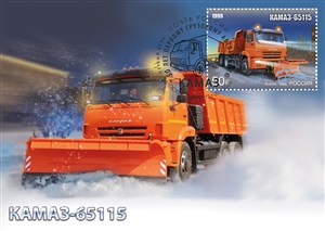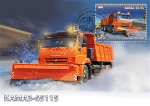 На почтовой марке и открытке изображена комбинированная дорожная машина на базе КАМАЗ-65115.