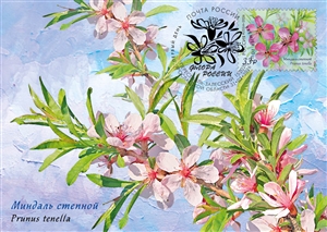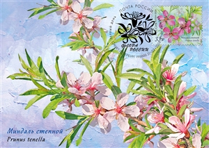 На почтовой марке и открытке изображен миндаль степной.