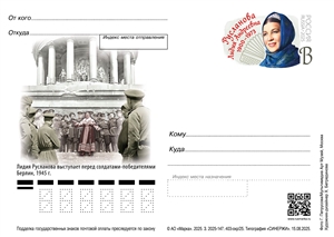 На оригинальной марке изображён портрет Л.А. Руслановой, на основной иллюстрации — фотография Г.Г. Петрусова «Певица Лидия Русланова выступает у Триумфальной колонны (колонны Победы)», Мультимедиа Арт Музей, Москва.