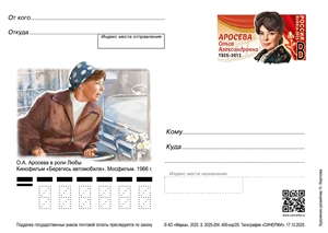 На оригинальной марке изображён портрет О.А. Аросевой на фоне занавеса и киноленты, на основной иллюстрации — кадр из кинофильма «Берегись автомобиля», (Мосфильм, 1966).