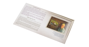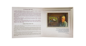 The composition of the souvenir pack in cover “Arkady A. Plastov (1893–1972) (2nd form of issue)” is included postal block №2594А “Arkady A. Plastov (1893–1972), artist, Academician of the Academy of Arts of the USSR” made on canvas-type design paper.