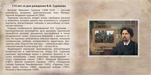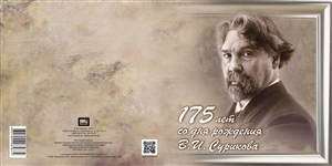 The composition of the souvenir pack in cover “175th Birth Anniversary of V. Surikov (2nd form of issue)” includes an imperforated postal block №3021А “Russian Academy of Arts. 175th Birth Anniversary of V. Surikov (1848–1916), painter” made on canvas-type design paper.