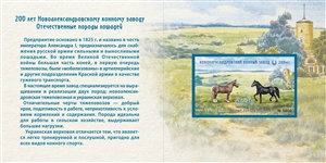 The postage stamps present an image of horses of the two breeds of the Novoaleksandrovsky stud farm; the margins of the souvenir sheet feature the main entrance to the stud farm building and the surroundings.