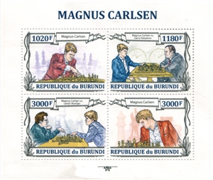 № 201А/7. Small sheet of Burundi. Chess. Magnus Carlsen vs G. Kasparov and L. Aronian