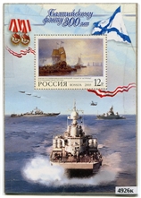 The Baltic Fleet was created by Peter the Great in the 18th century. The Fleet started functioning during the Northern War (100-1721), defended Moonsund islands, Tallin and Hanko during World War II, took part in the defence of Leningrad in 1941-1944, supported the ground forces invasion in Eastland, East Prussia and East Pomerania in 1944-1945). The stamp of the souvenir sheet features the copy of the picture "Capture of two Swedish battleships "Gedan" and "Astrild" by Russians at the Neva delta on May 7, 1703" painted in 1866 by A.P.Bogolyubov. The margins of the souvenir sheet feature modern battleships and aviation of the Baltic Fleet, two orders of Red Banner and St. Andrew’s flag.