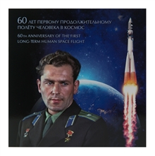 The postage stamp has an overprint of the new denomination, and the inscription on the stamp sheet is "60 years of the first long-term human flight into space".
