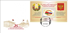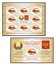 The postage stamp provides an image of the emblem of the Union State as well as Russian and Belarussian ornaments; the margins of the souvenir sheet feature coats of arms of the Republic of Belarus and the Russian Federation and quotes of the presidents of the states A. Lukashenko and V. Putin.