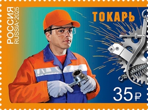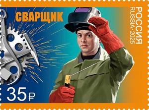 The postage stamps provide images of representatives of secondary vocational education professions: a turner and a welder.