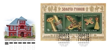 The postage stamps provides images of a sword belt buckle, a sword bar and a pommel, a bridle strap spacer, and a bell. The margins of the souvenir sheet feature other exhibits from the Kursk State Museum of Archaeology, as well as images illustrating the life of the Huns.