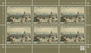 The postage stamp makes use of a drawing The Decembrist Uprising on December 14, 1825 by R. Frentz (1951, the Central Naval Museum of the Ministry of Defense of Russia).