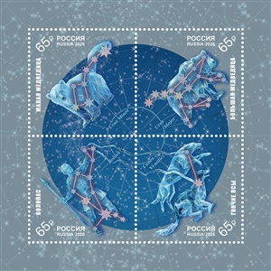 The postage stamps feature constellations of the Northern Hemisphere: Ursa Major, Ursa Minor, Canes Venatici, and Boötes.