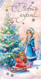 № 2025-187/5. Happy New Year! A Snegurochka (Snow Maiden) near the Christmas tree, a sleigh with a bag of gifts