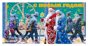 № 2025-188/5. Happy New Year! Ded Moroz (Father Frost) and Snegurochka (Snow Maiden) are walking arm in arm, people are carrying Christmas trees
