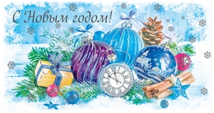 № 2025-189/5. Happy New Year! Blue and purple Christmas balls, gift, watch
