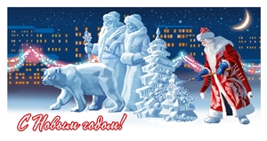 № 2025-195/5. Happy New Year! Ded Moroz (Father Frost) sculpts a snow figure on the background of a night city