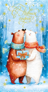 № 2025-197/5. Happy New Year! Brown and white bears with a gift in the New Year's forest