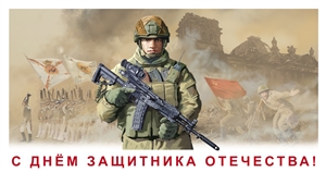 № 2026-010/5. Happy Defender of the Fatherland Day! A modern soldier with a machine gun against the background of historical military scenes