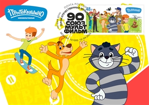 The postage stamp and card features characters from animated film Prostokvashino produced by JSC Soyuzmultfilm Film Studio.