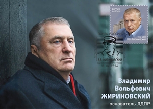 The postage stamp provides a portrait of the politician and the founder of the Liberal Democratic Party of Russia V. Zhirinovsky against the building of the State Duma of the Russian Federation.