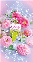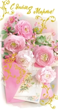 Happy 8th of March! Peony-shaped roses, an envelope with a postcard